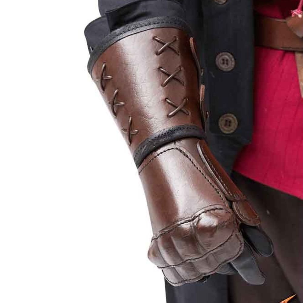 Elevate your cosplay and LARP adventures with these carefully engineered Brown Vegan Leather Gauntlets. Expertly produced from superior vegan leather, they deliver a genuine appearance and tactile sensation while remaining entirely free from animal-derived substances. Multiple adjustable straps and integrated buckles allow the wearer to achieve a snug and comfortable fit across a broad spectrum of arm dimensions. Whether embodying a valiant champion, a stealthy infiltrator, or a formidable warrior, these gauntlets impart an unrefined, battle-hardened character to your ensemble, flawlessly finishing the character with conviction.